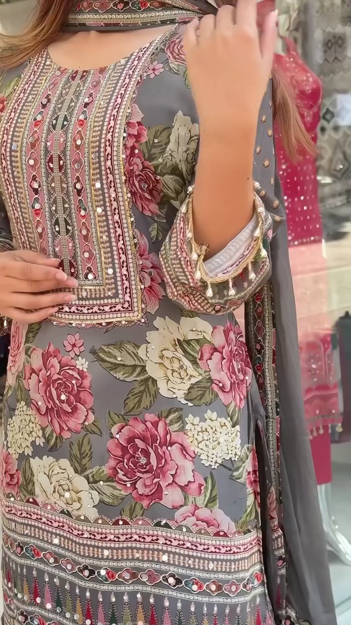 Featuring a stunning three-piece set with Alex synthetic top, georgette dupatta, and butter silk bottom.